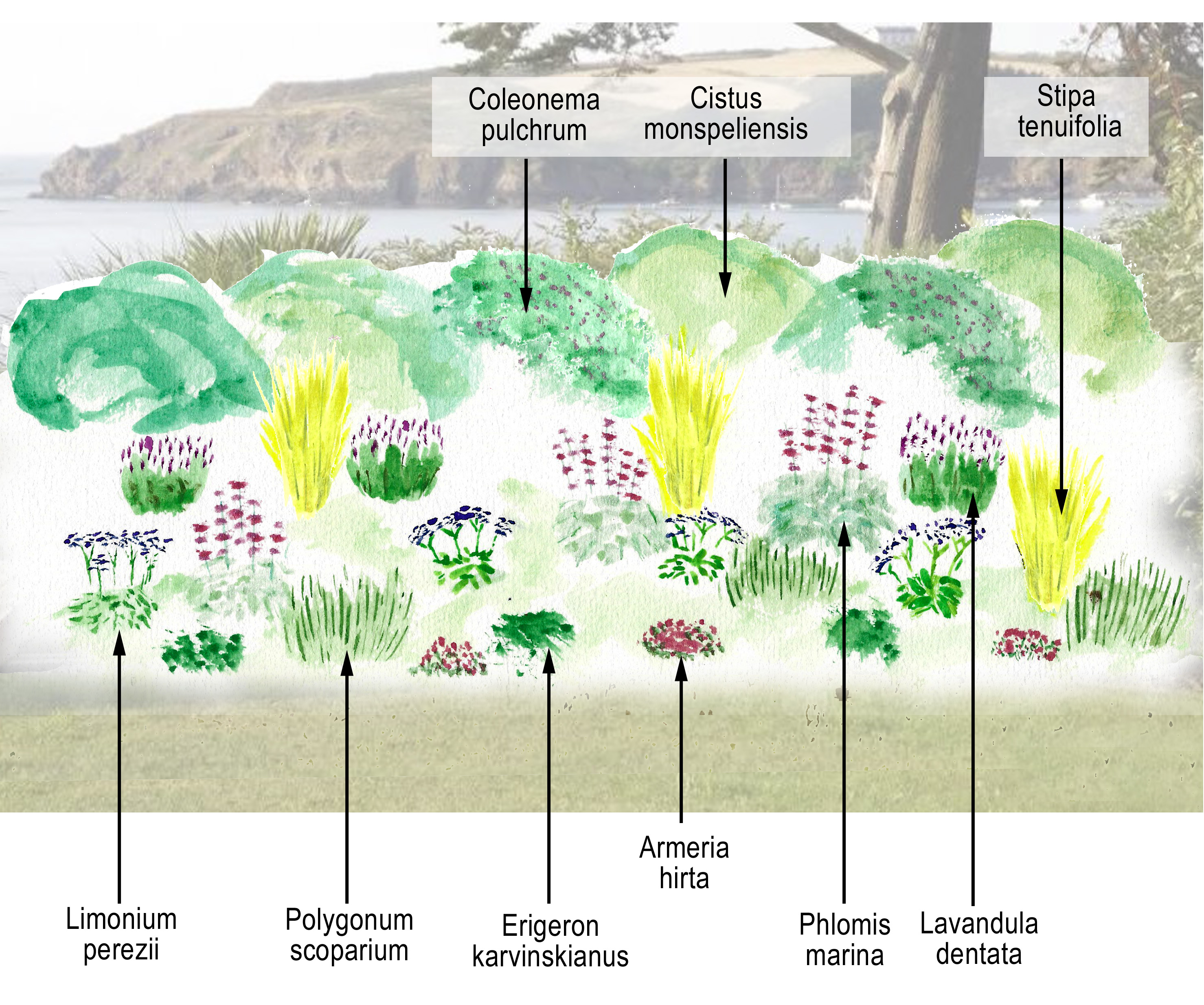 Voici une proposition de massif qui peut accompagner une allée pour un jardin de bord de mer car toutes les plantes évoquées sont résistantes aux embruns, mais on pourra facilement le reproduire plus loin de la mer car toutes les plantes sont adaptées au climat méditerranéen !